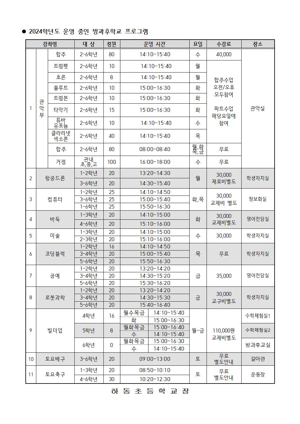 2024학년도 방과후학교 프로그램 수강신청에 관하여 안내하오니 참고하셔서 관심 있는 프로그램에 학생들이 참여할 수 있도록 협조 부탁드립니다.