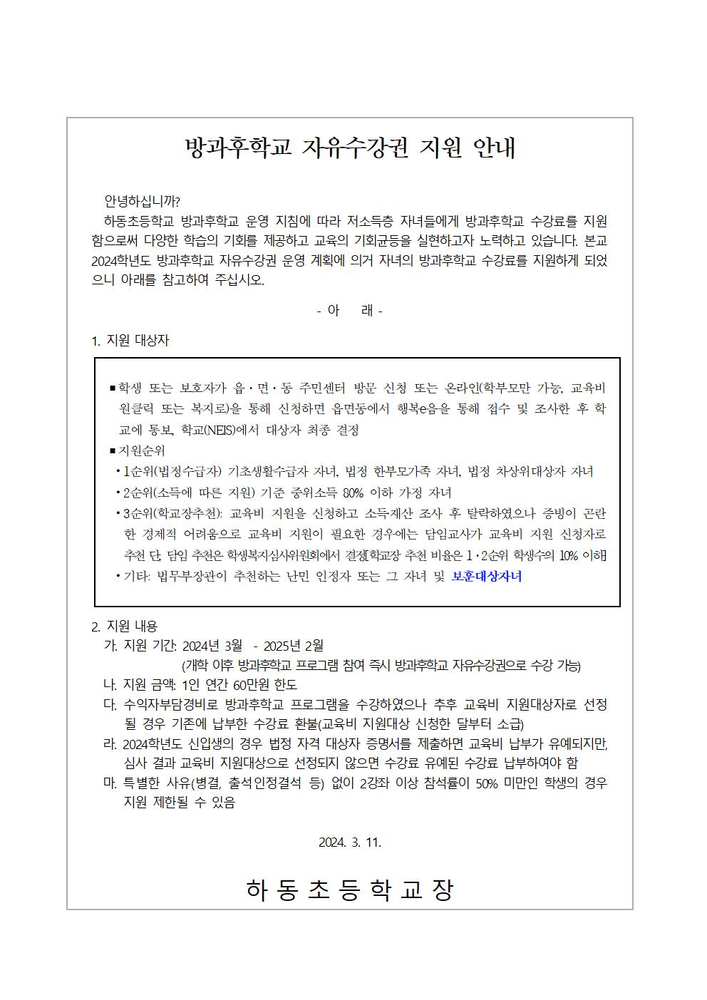 2024. 방과후학교 자유수강권 지원 안내
