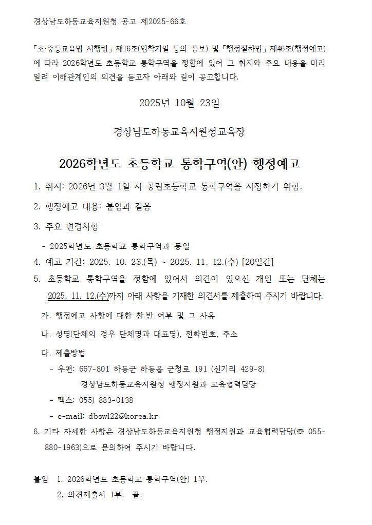 2026학년도 초등학교 통학구역(안) 행정예고 안내