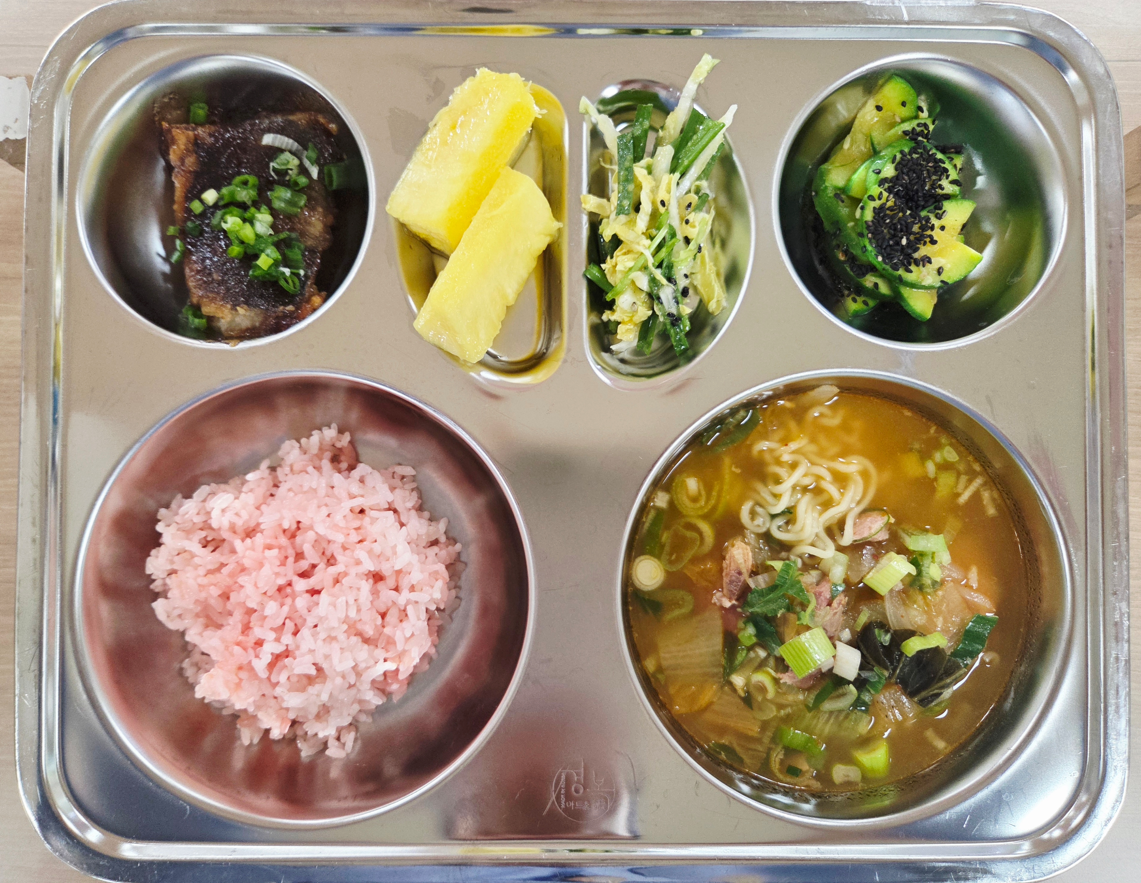 홍국쌀밥부대찌개(사리)(1.2.5.6.9.10.13.15.16)알배추무침(유자청)(13)애호박볶음(9)삼치데리야끼구이(5.6.13)(자율)배추김치(9)파인애플스틱우유(2)* 에너지/단백질/칼슘/철631.16/26.64/267.85/1.38
