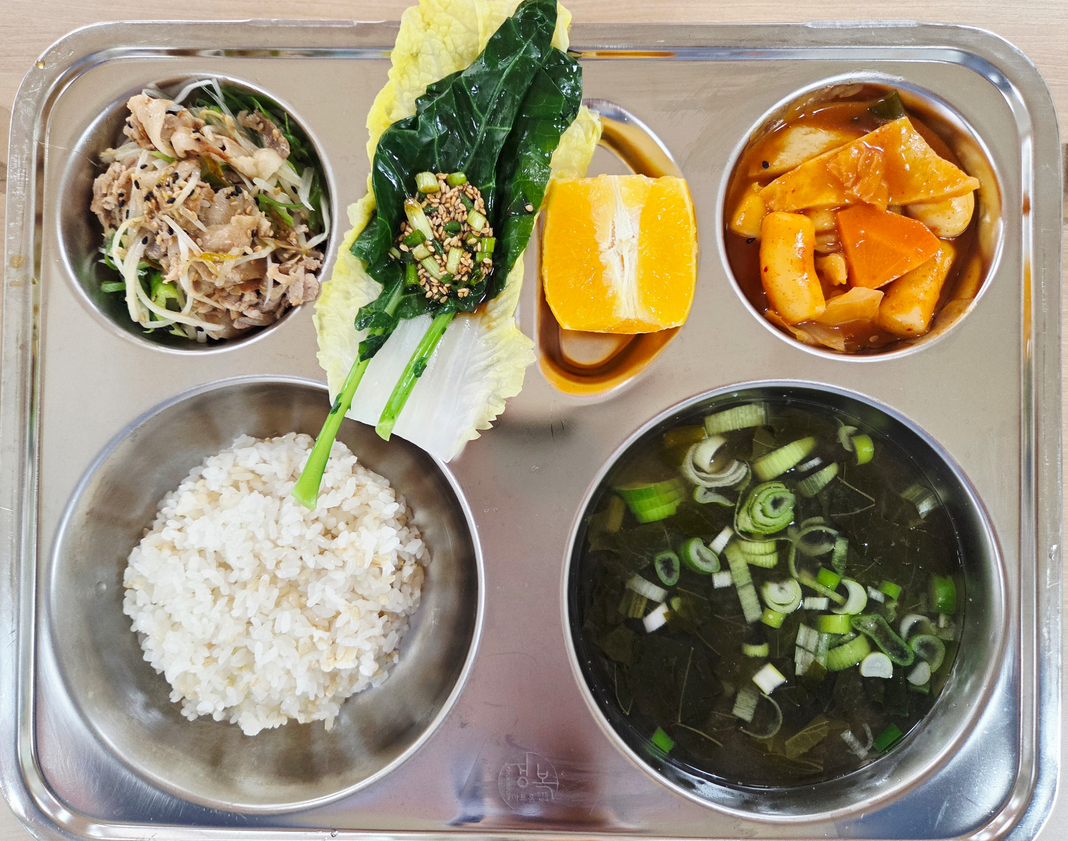 발아현미밥아욱국(5.6.9.18)국물떡볶이(1.5.6.9.13)대패삼겹살숙주볶음(5.6.10.13.18)(자율)배추김치(9)우유(2)황금향데친배추쌈(양념장)(5.6.13)* 에너지/단백질/칼슘/철713.80/32.56/421.65/3.80