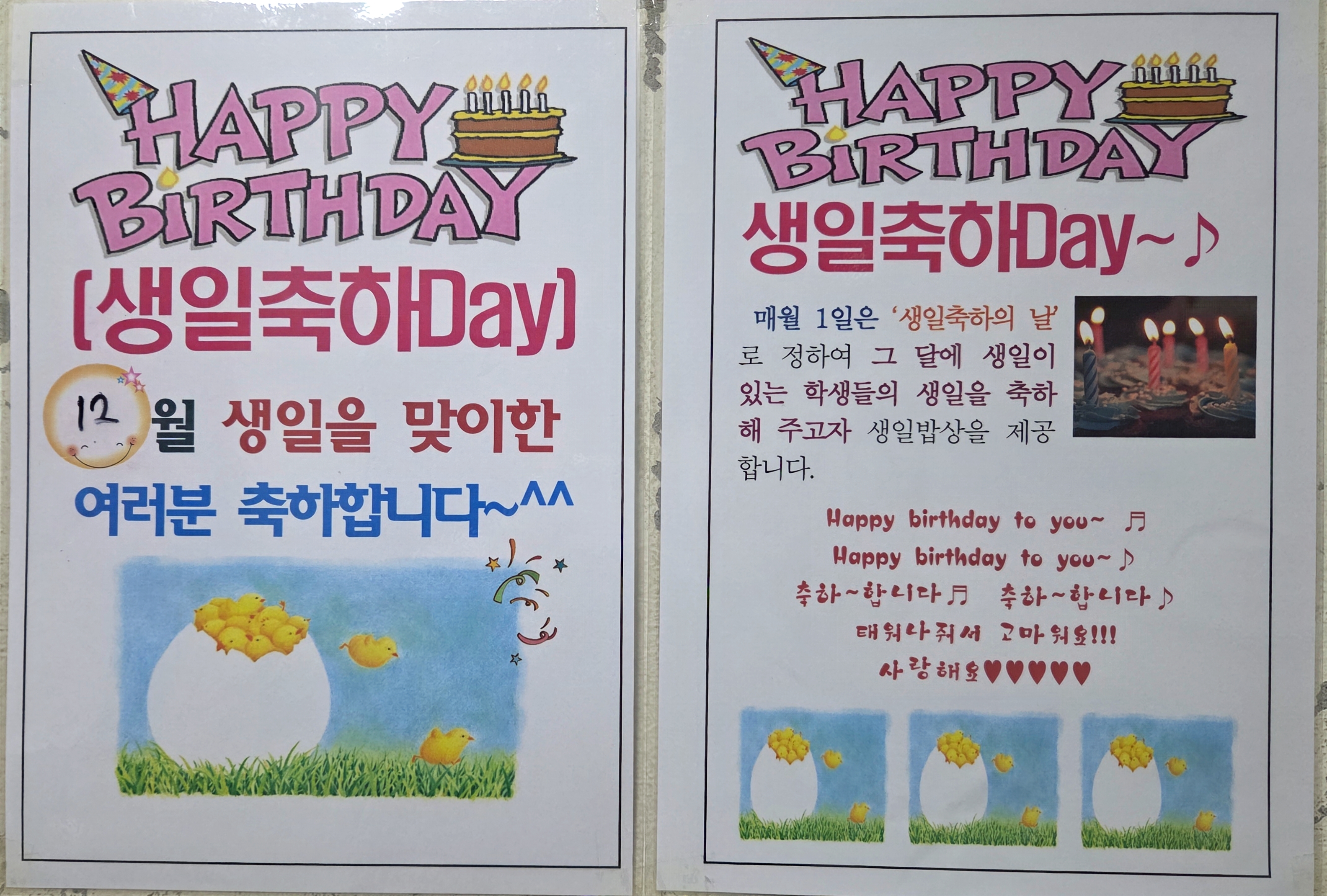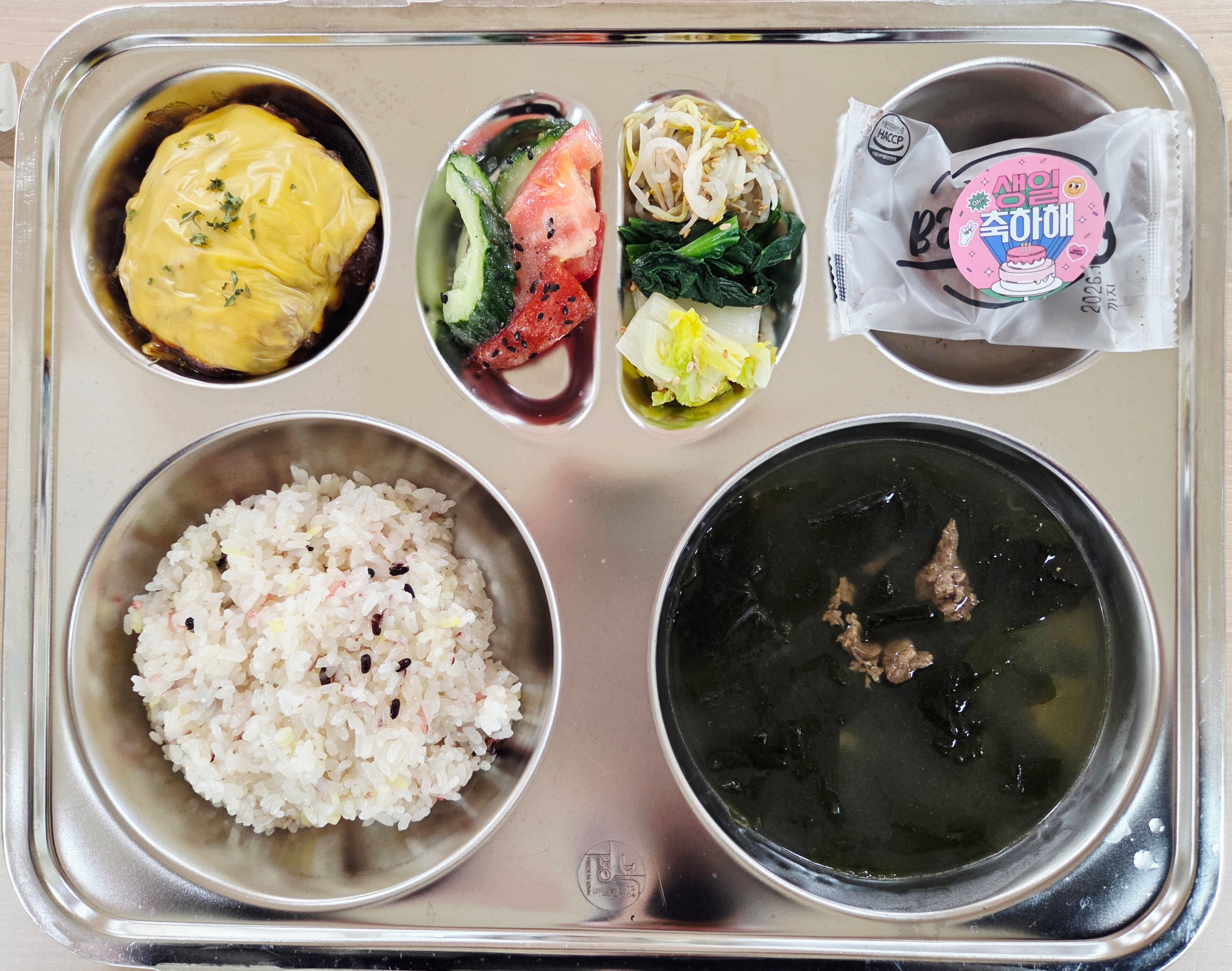생일찰밥쇠고기미역국(5.6.9.16.18)삼색나물(5.6.18)오이토마토무침(12.13)치즈함박스테이크(1.2.5.6.10.12.13.15.16)(자율)배추김치(9)우유(2)생일찹쌀떡(초코)(2.5.6)* 에너지/단백질/칼슘/철705.40/25.78/357.48/2.18