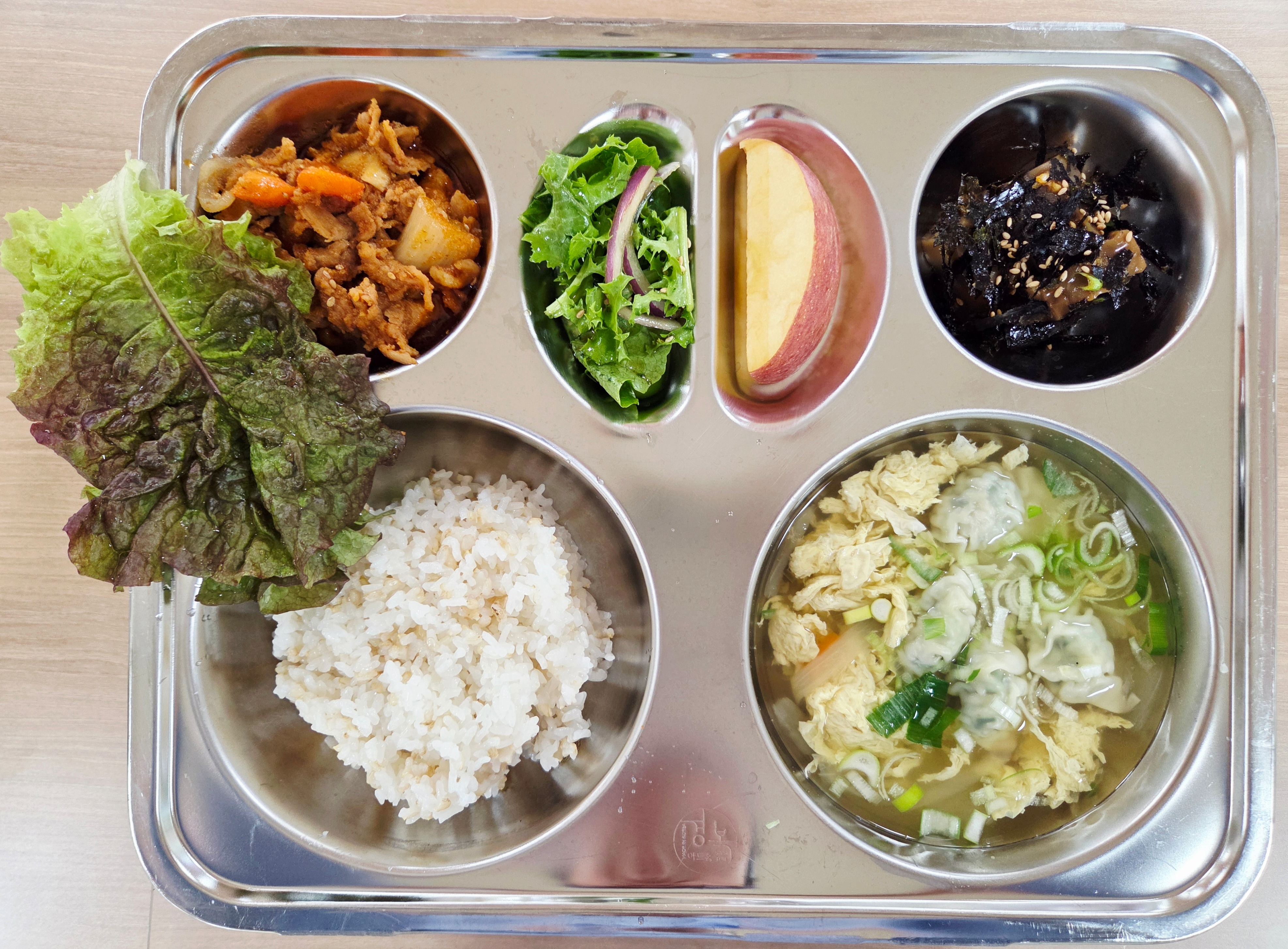 발아현미밥만두국(1.5.6.9.10.16.18)도토리묵(양념장)(5.6)상추겉절이(5.6.13)제육볶음(5.6.10.13)(자율)배추김치(9)사과한쪽(13)우유(2)* 에너지/단백질/칼슘/철617.35/30.49/276.13/4.12