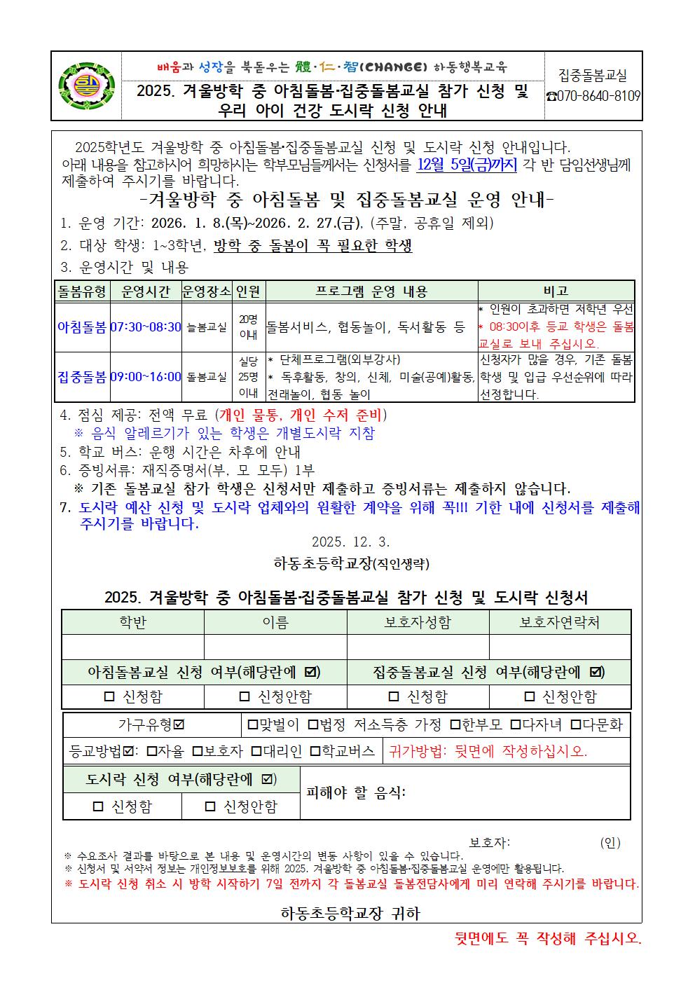 2025. 겨울방학 중 아침돌봄, 집중돌봄교실 참가 신청 및 우리 아이 건강 도시락 신청 안내