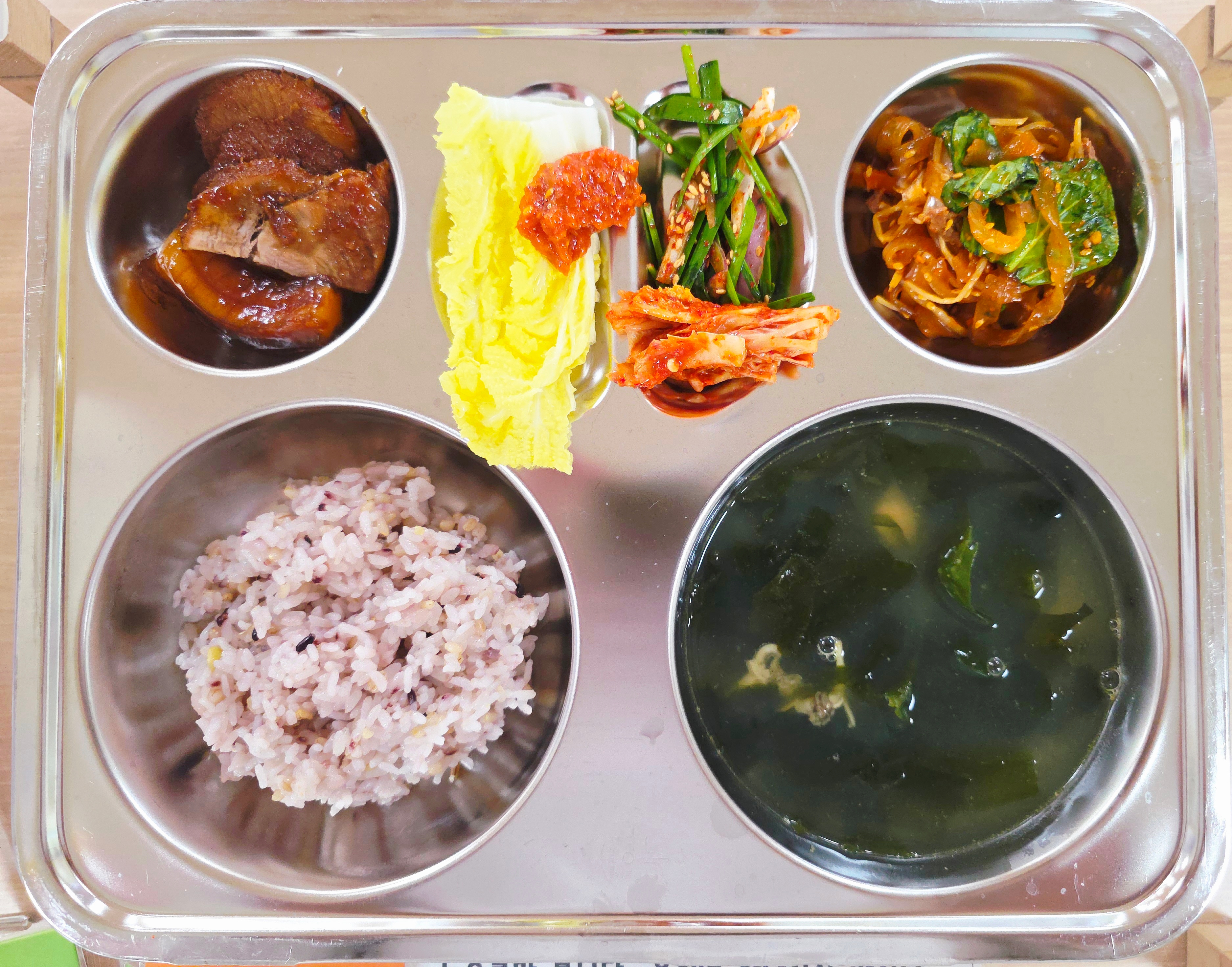 혼합14곡밥(5)해물미역국(5.6.9.13.18)분모자동파육(5.6.10.13.18)부추겉절이(5.6.13)콩나물매콤잡채(5.6.10.13.16.18)배추김치(9)우유(2)(자율)배추쌈(5.6)* 에너지/단백질/칼슘/철623.22/31.97/322.32/4.19