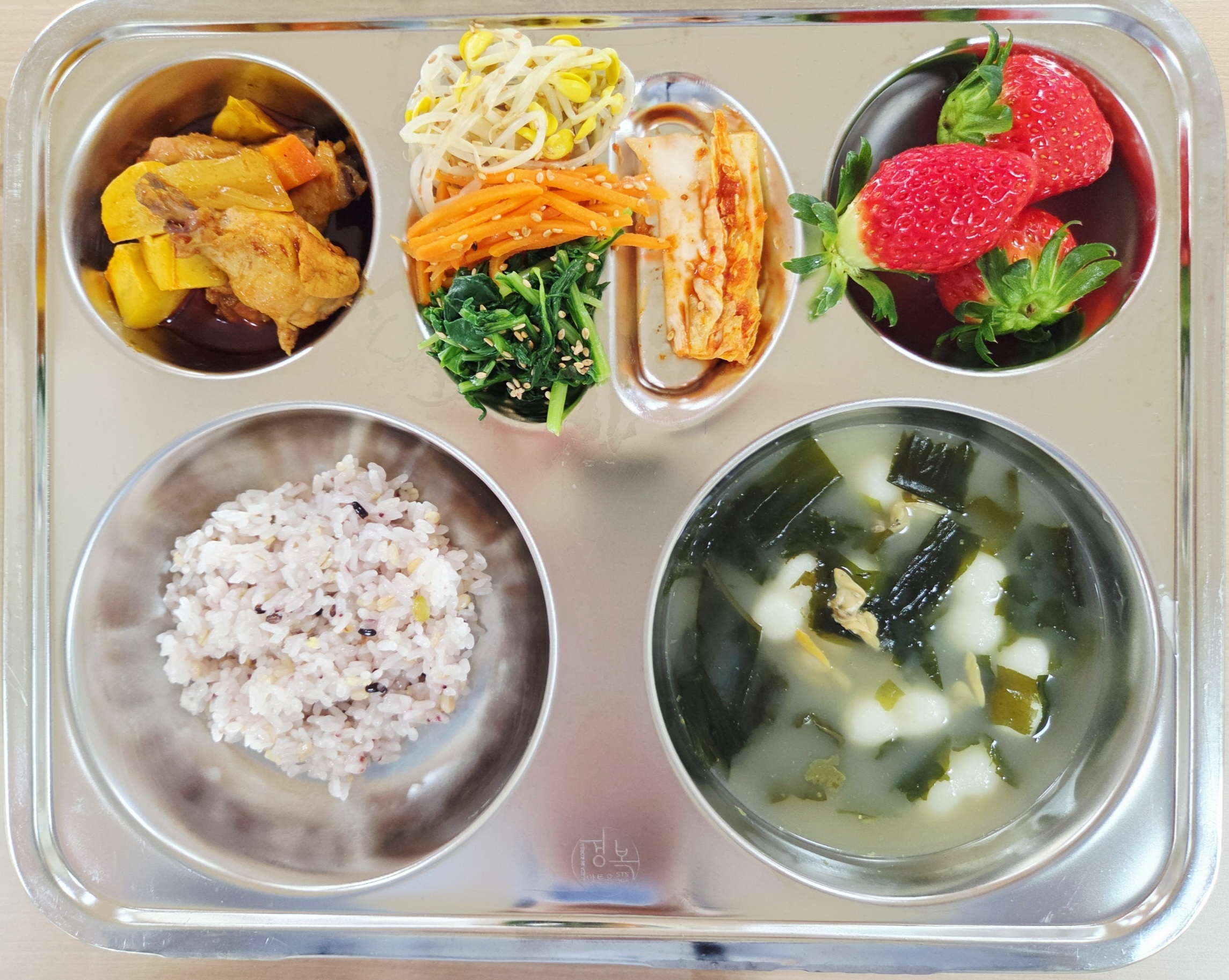 혼합14곡밥(5)조랭이떡미역국(5.6.9.16.18)삼색나물(5.6.18)닭볶음탕(2.5.6.12.13.15.16.18)배추김치(9)딸기우유(2)* 에너지/단백질/칼슘/철589.97/27.99/312.10/3.00