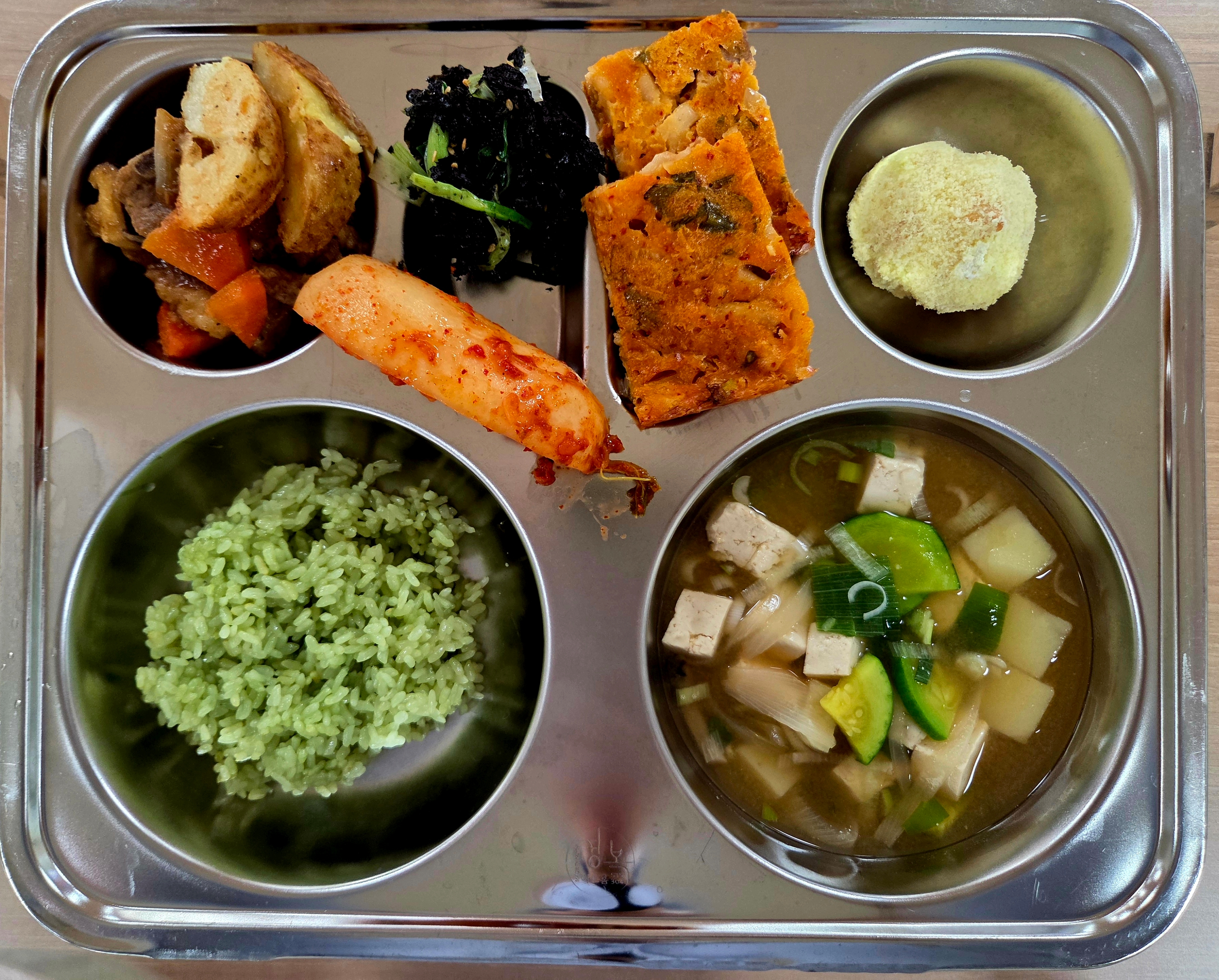클로렐라밥호박감자된장국(5.6.9)납작돼지갈비찜(5.6.10.12.13.18)김자반잔파무침(5.6.13)김치전(1.6.9.10)깍두기(9)메론크림슈(1.2.5.6)우유(2)* 에너지/단백질/칼슘/철749.28/33.30/345.47/3.51