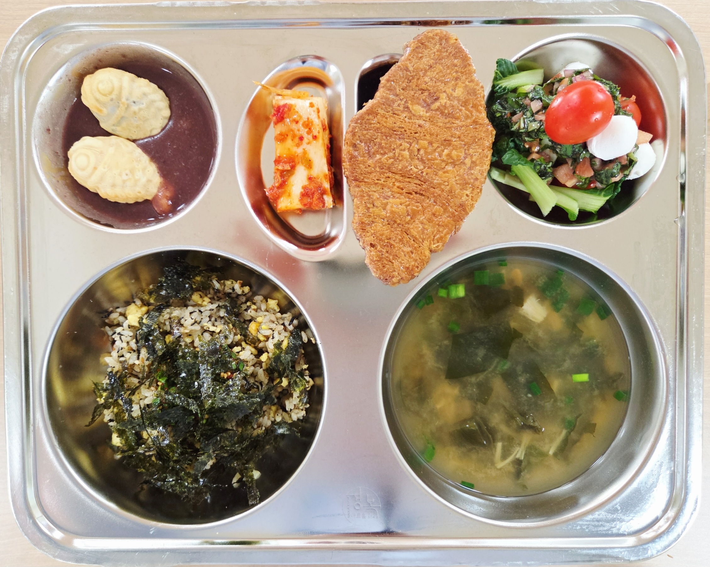전복영양밥&양념장(1.2.5.6.13.18)미니붕어빵&단팥죽(1.2.5.6.13)미역버섯된장국(5.6.9)(자율)배추김치(9)바싹크룽지(1.2.5.6)우유(2)카프레제샐러드(2.12.13)* 에너지/단백질/칼슘/철694.83/24.55/344.83/7.71